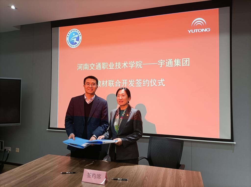 為加強(qiáng)學(xué)校現(xiàn)代產(chǎn)業(yè)學(xué)院內(nèi)涵建設(shè),切實(shí)提高教材建設(shè)水平,5月9日,宇通產(chǎn)業(yè)學(xué)院舉行了教材聯(lián)合開發(fā)簽約儀式,我校汽車學(xué)院副院長袁荷偉與宇通集團(tuán)教育公司研發(fā)部門負(fù)責(zé)人魏玲作為雙方代表進(jìn)行簽約。
