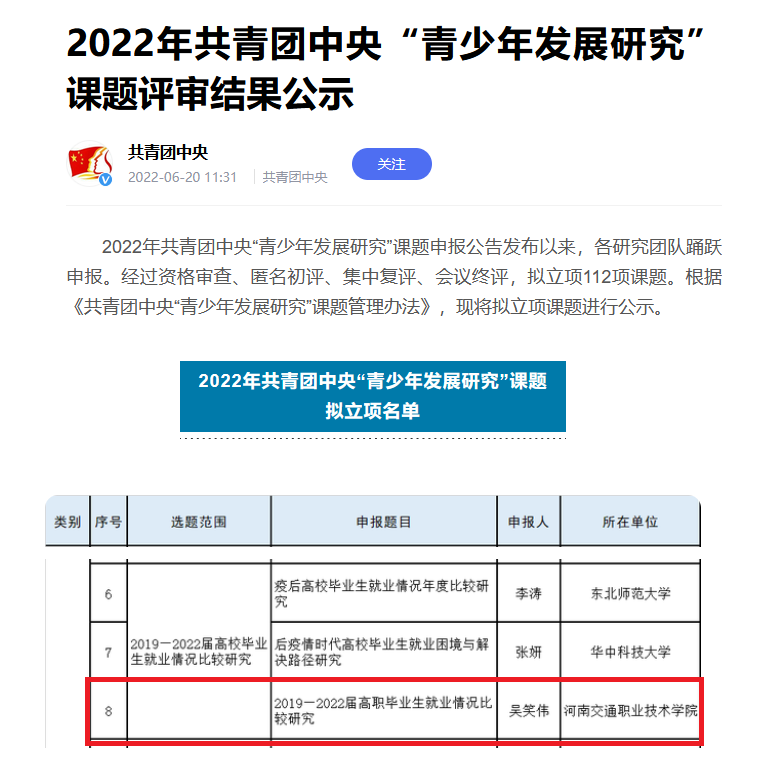 近日,共青團中央發(fā)布了《2022年共青團中央“青少年發(fā)展研究”課題擬立項名單》,汽車學院吳笑偉教授申報的《2019-2022屆高職畢業(yè)生就業(yè)情況比較研究》成功入選。此次立項的課題是共青團中央最高級別部級課題,全國僅一所高職院校、河南僅一所高校入圍,課題入選填補了學校、河南省高校、全國職業(yè)院校團中央課題立項空白,標志著我校“青少年發(fā)展”方向的科研水平已躋身全省前列。