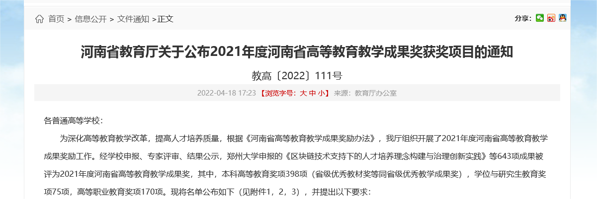 河南省高等教育教學(xué)成果獎(jiǎng)(高等職業(yè)教育)每兩年評(píng)選一次,旨在獎(jiǎng)勵(lì)在人才培養(yǎng)模式、課程體系、教學(xué)內(nèi)容、教學(xué)管理等方面具有原創(chuàng)性、實(shí)用性、示范性的教育教學(xué)成果,是對(duì)學(xué)校人才培養(yǎng)工作和教育教學(xué)改革成果的全面展示。本次獲獎(jiǎng)成果充分展示了我校近年來在人才培養(yǎng)、專業(yè)建設(shè)、教學(xué)改革等方面取得的成效。學(xué)校將充分發(fā)揮省級(jí)教學(xué)成果獎(jiǎng)的示范輻射作用,持續(xù)加大教學(xué)改革力度,進(jìn)一步提高教育教學(xué)水平和人才培養(yǎng)質(zhì)量。
