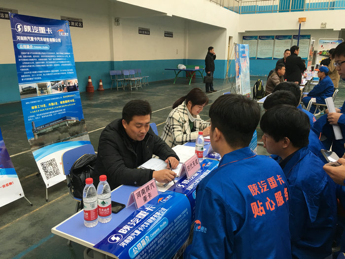 2017年第二屆陜汽重卡精英班共招收學員40余名,2017年6月3日舉行營銷專場招聘會,20名營銷專業(yè)學員與企業(yè)達成就業(yè)意向并簽約;2017年11月22日舉行維修專場招聘會,20名維護專業(yè)學員與企業(yè)達成就業(yè)意向并簽約。