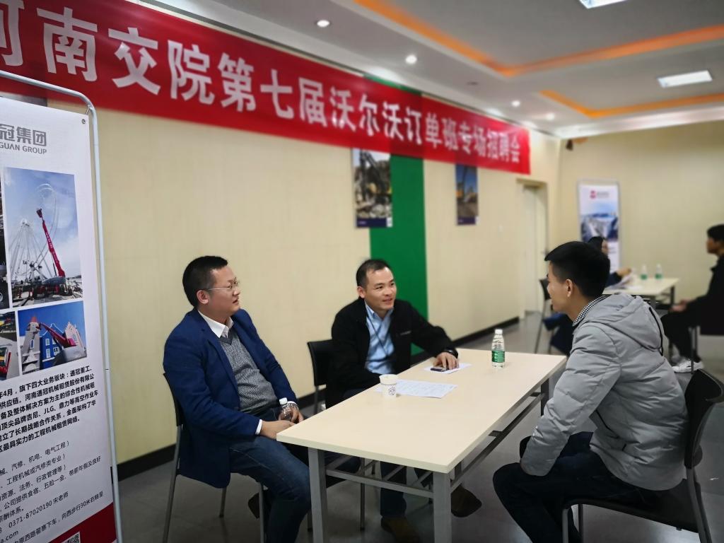 接下來河南通冠集團代表旗下的子公司—河南沃通、通冠重工、通冠高空平臺租賃股份有限公司等進行了招聘,提供的崗位主要有工程機械售后服務(wù)、營銷、配件支持、營銷支持、高空平臺作業(yè)服務(wù)。我院16級工程機械運用技術(shù)專業(yè)學(xué)生積極參加本次招聘會,共有近20名同學(xué)與單位達成了就業(yè)意向。