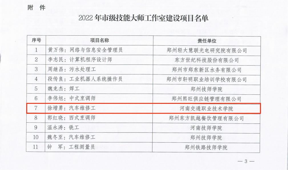 近日,鄭州市人力資源和社會(huì)保障局、鄭州市財(cái)政局公布了2022年鄭州市技能大師工作室建設(shè)項(xiàng)目名單,我校汽車學(xué)院徐增勇副教授主持申報(bào)的汽車維修工技能大師工作室成功獲批,這是我校獲批建設(shè)的首個(gè)鄭州市技能大師工作室。