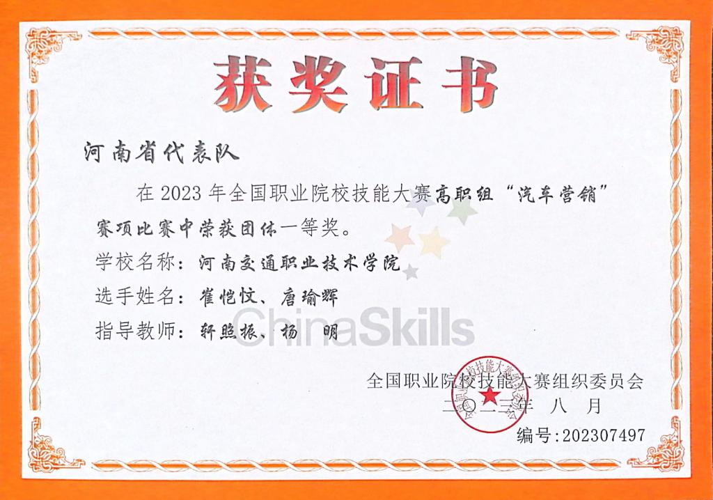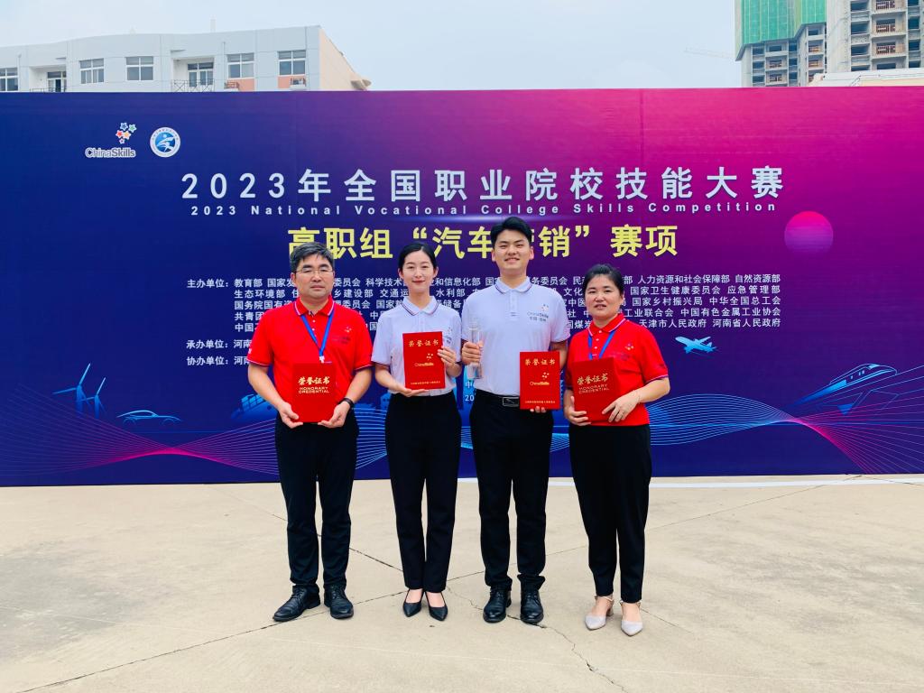 8月23日至24日,2023年全國(guó)職業(yè)院校技能大賽高職組“汽車(chē)營(yíng)銷(xiāo)”賽項(xiàng)在我校舉辦。我校參賽團(tuán)隊(duì)代表河南省高職院校從全國(guó)68支隊(duì)伍中脫穎而出,崔愷忟、唐瑜輝兩位同學(xué)勇奪大賽一等獎(jiǎng),軒照振、楊明兩位教師喜獲優(yōu)秀指導(dǎo)教師獎(jiǎng)。這是我校學(xué)子在2023年全國(guó)職業(yè)院校技能大賽高職組賽項(xiàng)中斬獲的第二枚國(guó)賽金牌。