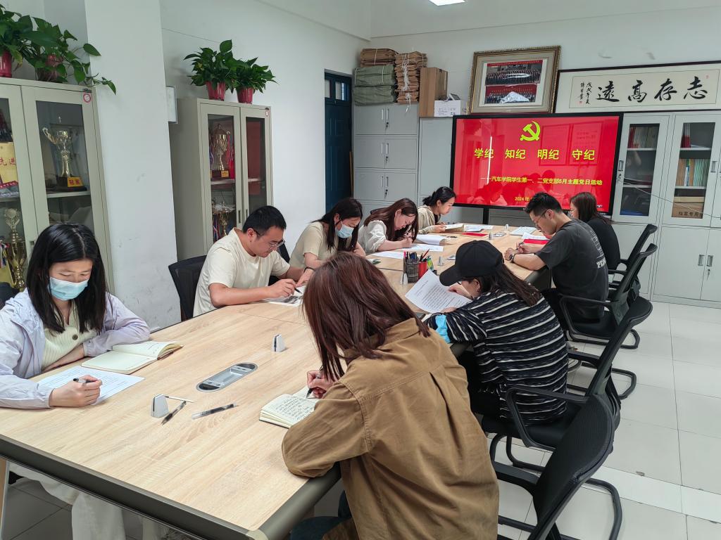 5月16日下午,汽車(chē)學(xué)院學(xué)生第一、二黨支部在躬行樓202開(kāi)展“學(xué)紀(jì)、知紀(jì)、明紀(jì)、守紀(jì)”主題黨日活動(dòng)。活動(dòng)由支部書(shū)記賈穎慧主持,全體黨員參加。