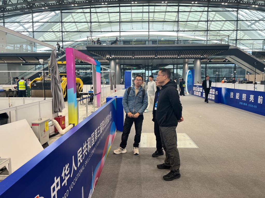 在比賽現(xiàn)場,李小強一行深入賽項場地,仔細觀摩劉毅的操作流程,詳細詢問比賽環(huán)節(jié)設(shè)置、核心技術(shù)難點及選手適應(yīng)情況,叮囑選手沉著應(yīng)戰(zhàn)、發(fā)揮水平,同時關(guān)心工作人員的后勤保障需求。隨后,在國家成果展館,李小強與交通運輸部職業(yè)資格中心職業(yè)技能競賽處處長張巍展開深入交流。張巍對我校在交通運輸行業(yè)選拔賽中的優(yōu)異成績給予高度肯定,特別感謝我校對第三屆全國職業(yè)技能大賽的全力支持。期間,李小強一行還與天津交通、寧波技師等院校的領(lǐng)隊及大賽專家深入交流探討,圍繞技能人才培養(yǎng)模式、賽教融合路徑等話題分享實踐經(jīng)驗。