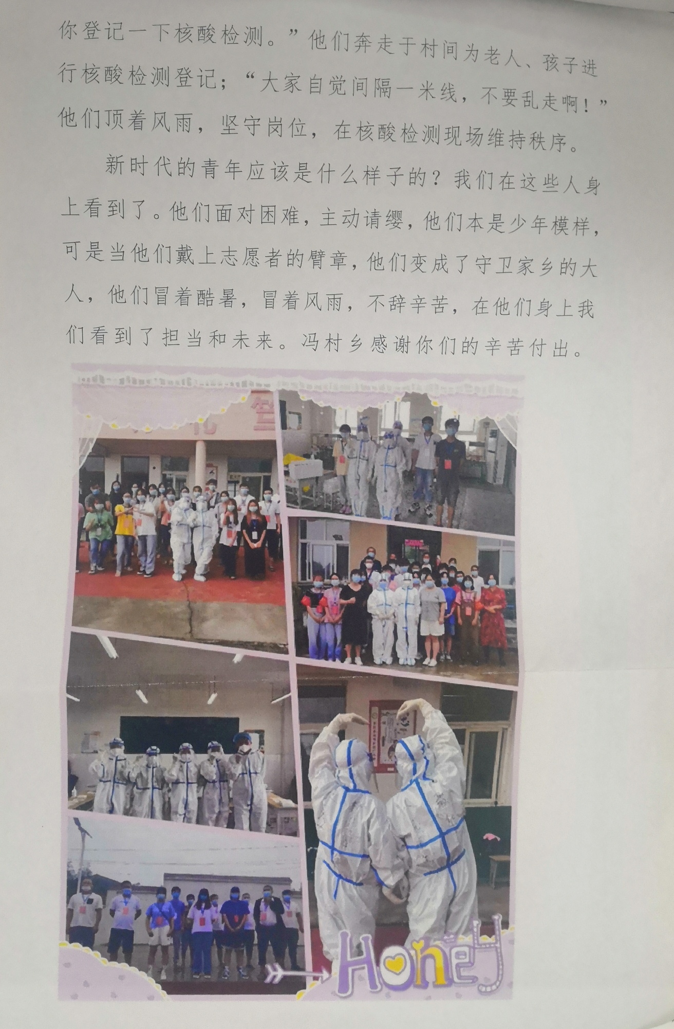7月28日以來,馮村鄉(xiāng)黨委向全鄉(xiāng)團(tuán)青、青年發(fā)出科學(xué)有序參與疫情防疫工作的倡議。王祖賀同學(xué)積極響應(yīng)、挺身而出,勇挑重?fù)?dān)、逆流而上,以“召之即來、來之能戰(zhàn)、戰(zhàn)之必勝“的勇氣和信念,義無反顧投身疫情阻擊戰(zhàn),為疫情防控工作奉獻(xiàn)了青春力量。感謝我校王祖賀同學(xué)在2021年馮村鄉(xiāng)新冠肺炎疫情志愿服務(wù)行動中無私奉獻(xiàn)和辛苦付出,為家鄉(xiāng)疫情防控工作作出了積極貢獻(xiàn)。感謝我校對王祖賀同學(xué)細(xì)心培養(yǎng)、殷切關(guān)懷,讓其能夠健康成長,樹立正確的人生觀、價值觀,為成為國家的有用人才奠定了良好的基礎(chǔ)。