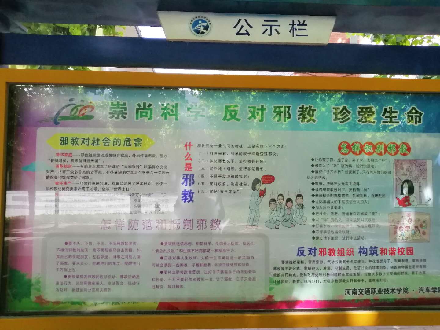 活動(dòng)中,汽車學(xué)院團(tuán)總支牢牢把握輿論導(dǎo)向,安排各班通過(guò)觀看反邪教教育影片、輔導(dǎo)員講解并借助PPT多角度向同學(xué)們講述邪教的基本特點(diǎn)、邪教的騙人手法和危害,以及如何防范邪教等等方面的內(nèi)容,此外汽車學(xué)院還積極通過(guò)校園宣傳櫥窗和教學(xué)樓宣傳展板、微信公眾號(hào)等多種宣傳媒介在師生中大力開展宣傳教育活動(dòng),積極宣傳黨和政府防范和處理邪教問(wèn)題的方針政策,揭露邪教本質(zhì)與危害,倡導(dǎo)大家做反邪的先行者,做文明的交院人。