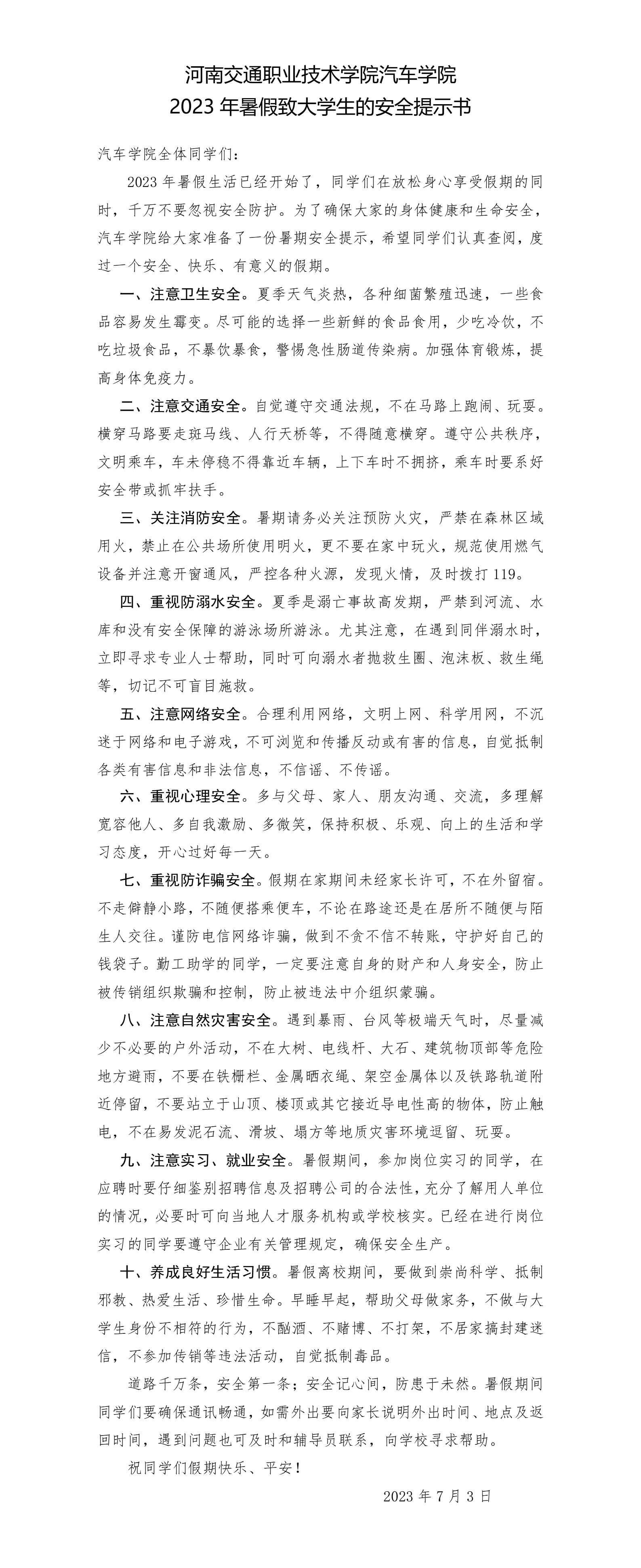 河南交通職業(yè)技術(shù)學(xué)院汽車學(xué)院2023年暑假致大學(xué)生的安全提示書