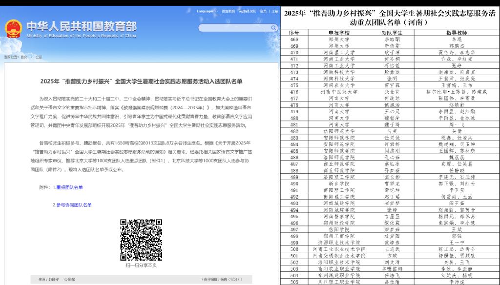 近日,教育部公布《2025年“推普助力鄉(xiāng)村振興”全國大學生暑期社會實踐志愿服務活動入選團隊名單》,由河南交通職業(yè)技術學院汽車學院黨總支黨員教師軒照振、賈穎慧指導,預備黨員方政為隊長的“交息相連”推普助力鄉(xiāng)村振興實踐團在眾多隊伍中脫穎而出,成功入選重點團隊。